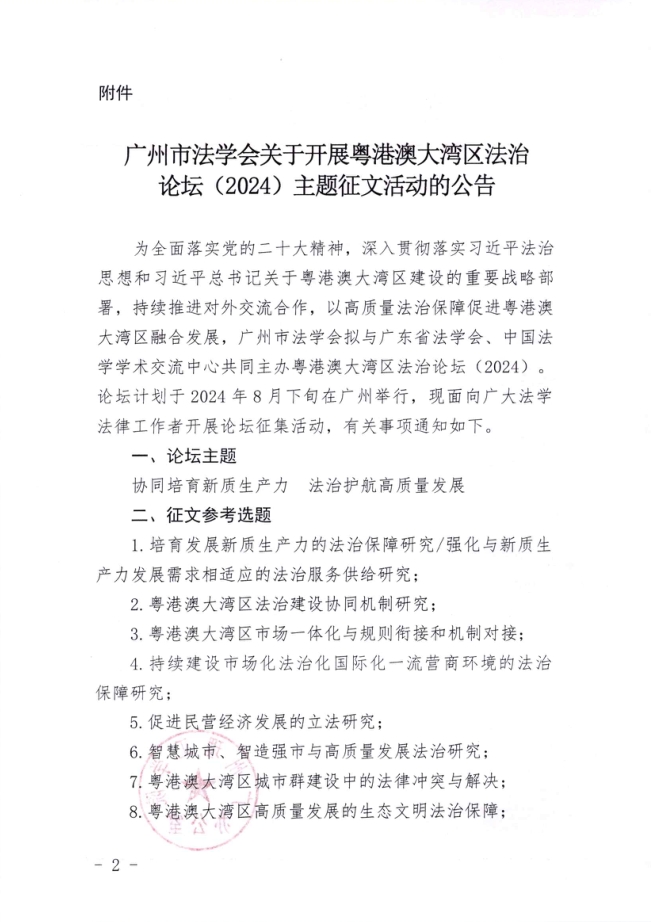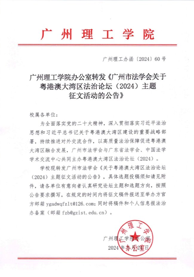 关于转发《广州市法学会关于粤港澳大湾区法治论坛(2024)主题征文活动的公告》的通知