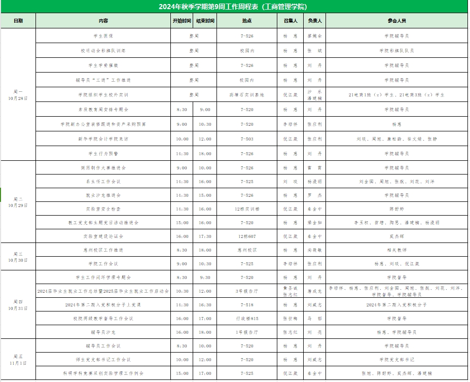suncitygroup太阳集团2024年秋季学期第9周工作周程表