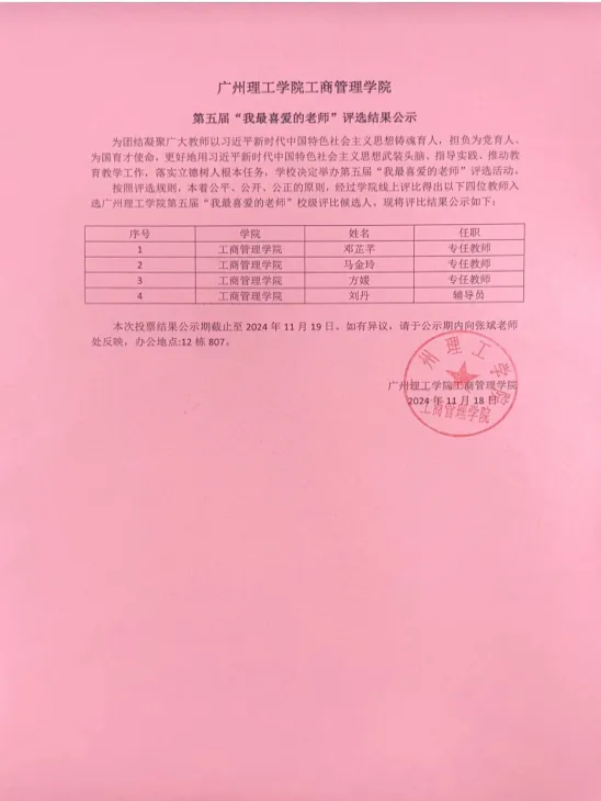 本次投票结果公示期截止至2024年11月19日。如有异议,请于公示期内向张斌老师处反映,办公地点:12栋807。