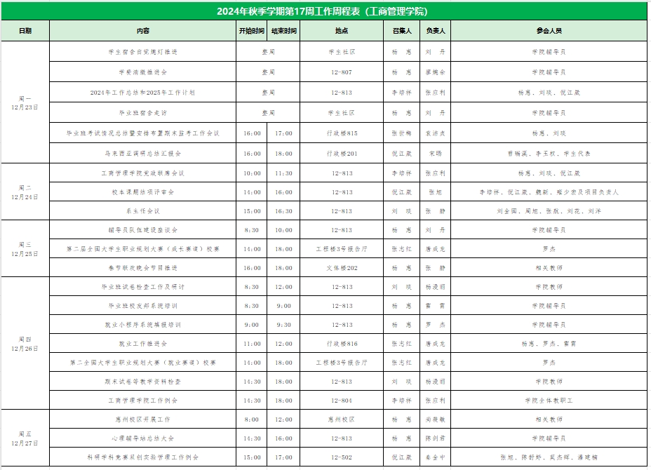 suncitygroup太阳集团2024年秋季学期第17周工作周程表