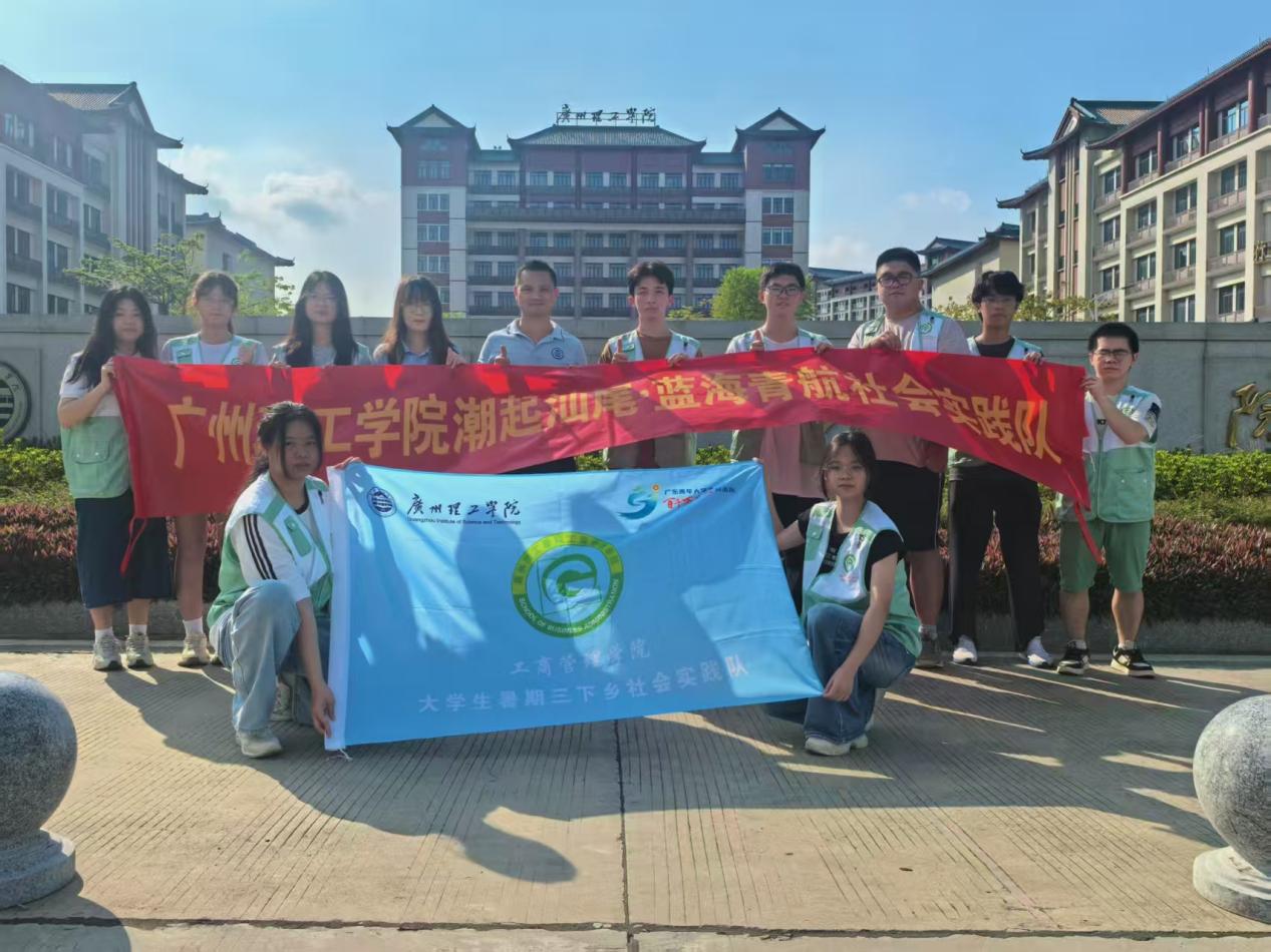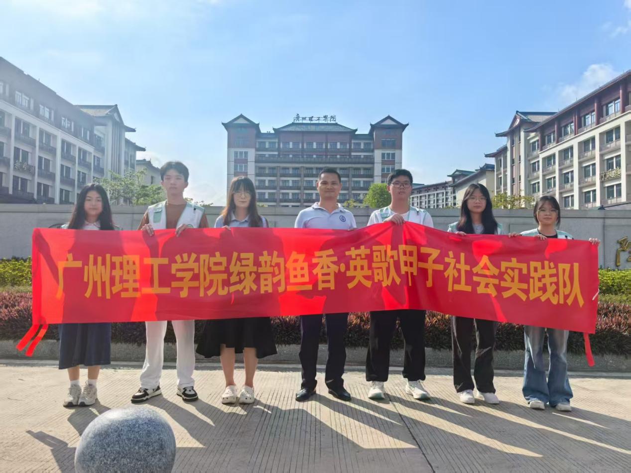 校门口,阳光正好。英韵乡播队的队员们身着统一队服,精神抖擞地站成整齐队列,尚筱敏老师站在队伍前排,与队员们并肩而立。每个人脸上都挂着明亮的笑容,眼神里满是对前路的期待,有人悄悄整理着队旗边角,有人和身旁队友相视鼓劲,快门按下的瞬间,“广州理工学院”的校门与这群朝气蓬勃的身影一同被定格。